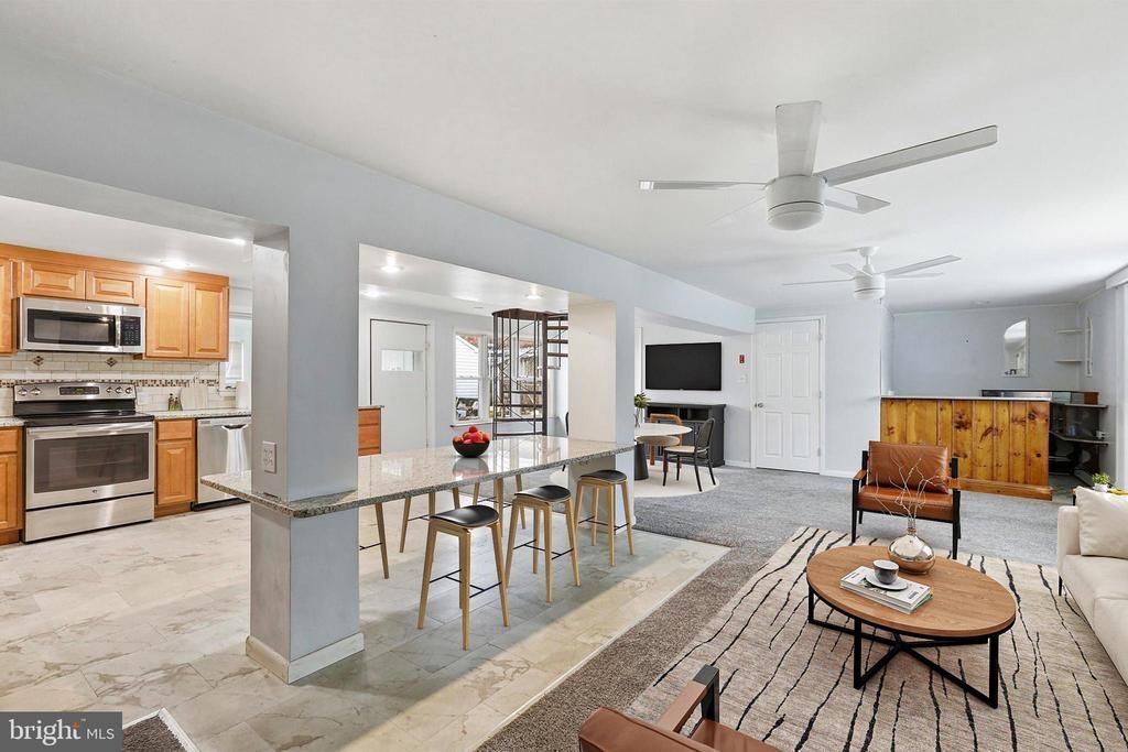 Rare opportunity awaits in the Pennsbury School District! This spacious Tullytown Borough home offers over 1,800 square feet of living space and a versatile layout, presenting a wonderful opportunity for the next owner to update and make it their own. Ideally located within walking distance to the Levittown/Tullytown SEPTA Regional Rail train station and just minutes to Route 13, Route 1, the PA and NJ Turnpikes, making this a great commuter location. The home features an enclosed front porch entry leading into a large open great room floor plan combining the living room and kitchen area. The kitchen offers wood cabinetry, granite countertops, stainless steel appliances, and a wet bar area, creating a space ideal for everyday living and entertaining. The main level also includes a laundry room, bedroom, and full bath, providing the option for convenient one-floor living. A spiral staircase and side staircase lead to the second level, which features an open floor plan with a kitchenette, two large bedrooms (previously three bedrooms), a full bath, and a bonus room. The flexible layout offers a variety of possibilities, including extended living space, home office areas, or guest accommodations. The layout and size of the home present an excellent opportunity for buyers looking to customize, renovate, and add value. Property is being sold AS-IS. Buyer is responsible for all Tullytown Borough Use & Occupancy requirements.